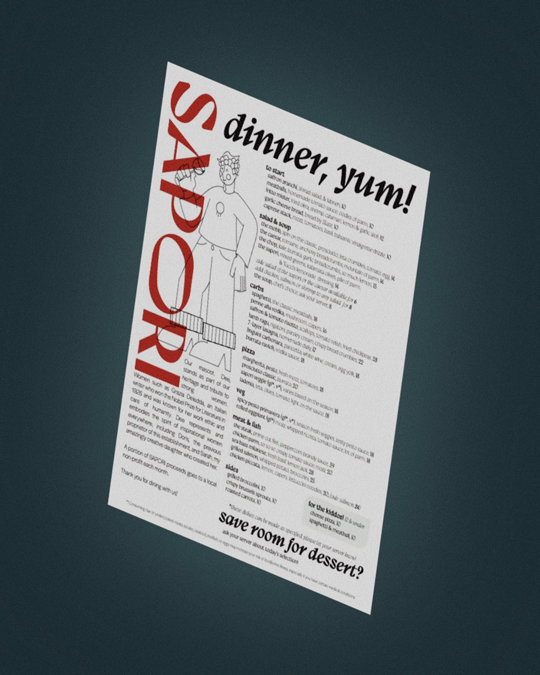 In addition to some of the menu items: I designed the logo, the branding kit, the paper menu, some of the artwork for the interior space, and the mascot (which was inspired by a mural that was up at the previous tenants spot, Tucci’s).